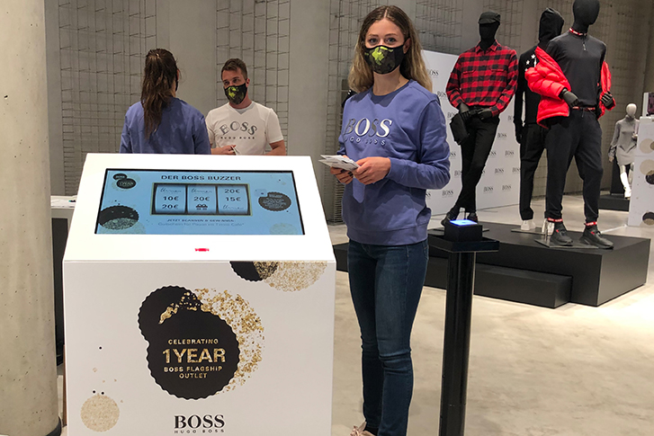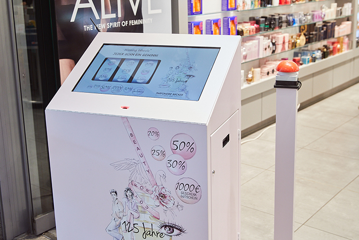 Der Gewinn (z.B. Einkaufsgutschein) wird auf dem Monitor angezeigt, direkt ausgedruckt und kann sofort im Store eingelöst werden.