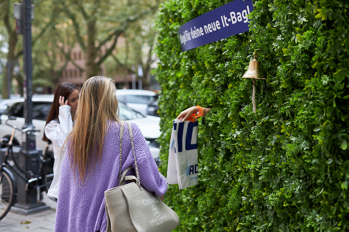 Auf der Kö spielte Action mit dem Klischee, dass man auf der Kö für eine Einkaufstasche schnell das ausgibt, wofür man bei Action den ganzen Einkaufswagen vollpacken kann. Das patentierte Eventmodul “The Living Hedge®” überreichte aus einer eleganten Hecke heraus Action-Tüten an die Besucher, wenn sie die Glocke läuteten. In den Tüte befanden sich Gewinnspielflyer, die in der neuen Filiale einlösbar waren. Die Filiale war schnell zu erreichen: Die Besucher konnten in eine Rikscha steigen, die sie im Eiltempo zu Action brachte.